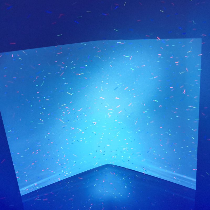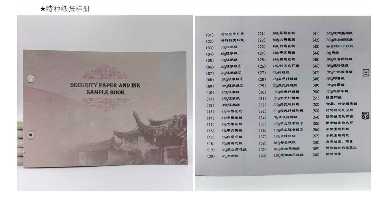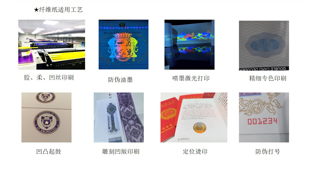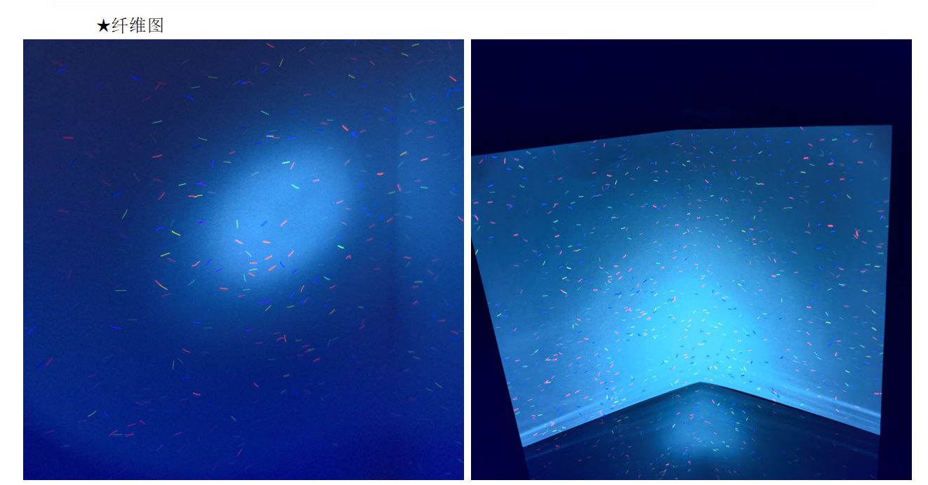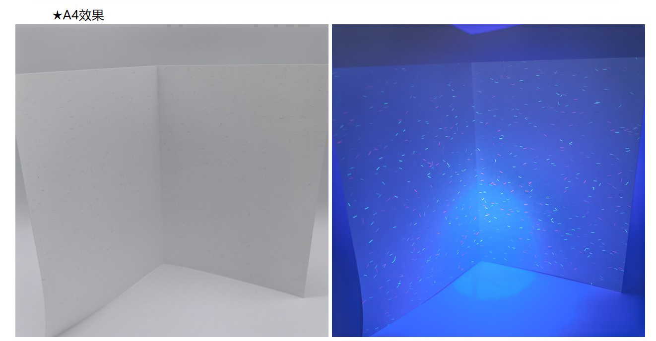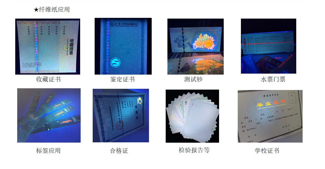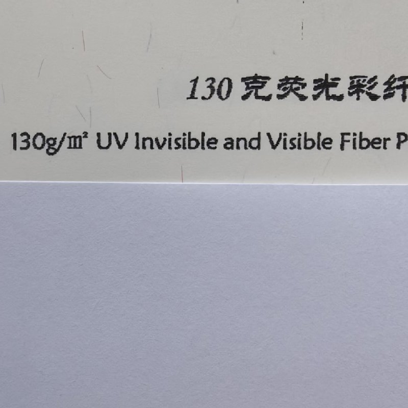 纤维纸:造纸时将红蓝等有(yǒu)色纤维或彩色小(xiǎo)片(点)掺入纸浆内,或在纸张未定型前撒在纸张表面,在紫外線(xiàn)照射下有(yǒu)荧光反射,使纸中(zhōng)带有(yǒu)區(qū)别于纸张本身的有(yǒu)色纤维。掺入纸浆中(zhōng)的红蓝纤维丝和彩点有(yǒu)彩色纤维与无色荧光纤维两种。