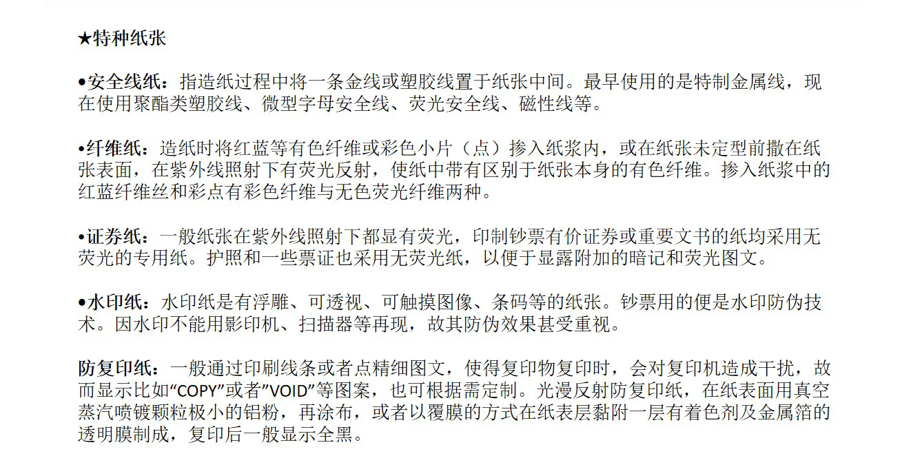 纤维纸:造纸时将红蓝等有(yǒu)色纤维或彩色小(xiǎo)片(点)掺入纸浆内,或在纸张未定型前撒在纸张表面,在紫外線(xiàn)照射下有(yǒu)荧光反射,使纸中(zhōng)带有(yǒu)區(qū)别于纸张本身的有(yǒu)色纤维。掺入纸浆中(zhōng)的红蓝纤维丝和彩点有(yǒu)彩色纤维与无色荧光纤维两种。