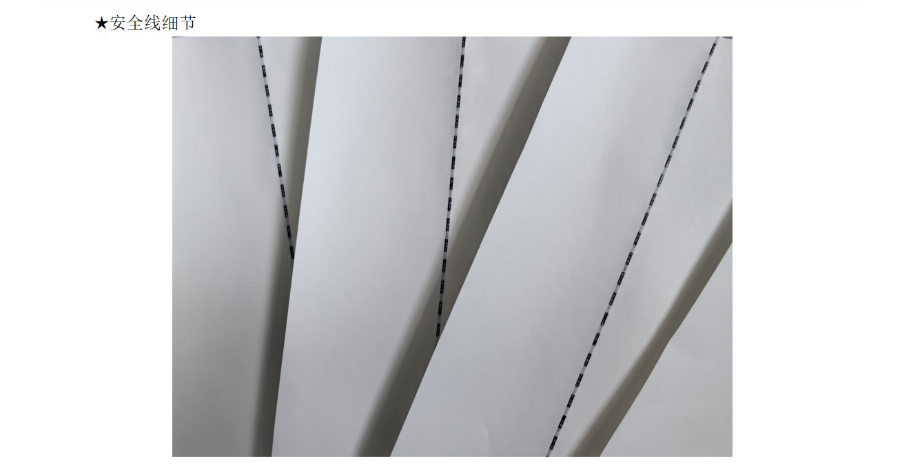 安(ān)全線(xiàn)纸:指造纸过程中(zhōng)将一条金線(xiàn)或塑胶線(xiàn)置于纸张中(zhōng)间。起初使用(yòng)的是特制金属線(xiàn),现在使用(yòng)聚酯类塑胶線(xiàn)、微型字母安(ān)全線(xiàn)、荧光安(ān)全線(xiàn)、磁性線(xiàn)等。